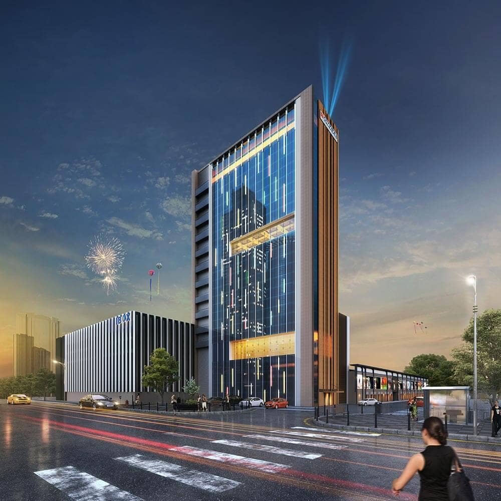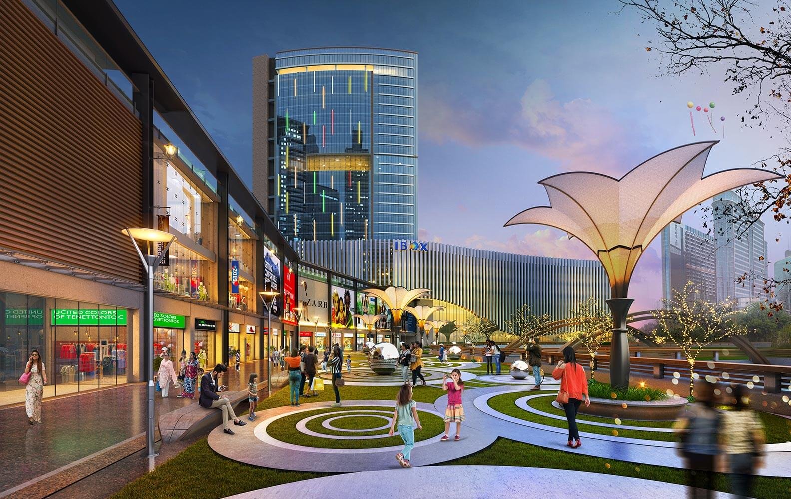 Modern commercial destination featuring office spaces, retail zones, dining hubs & business suites